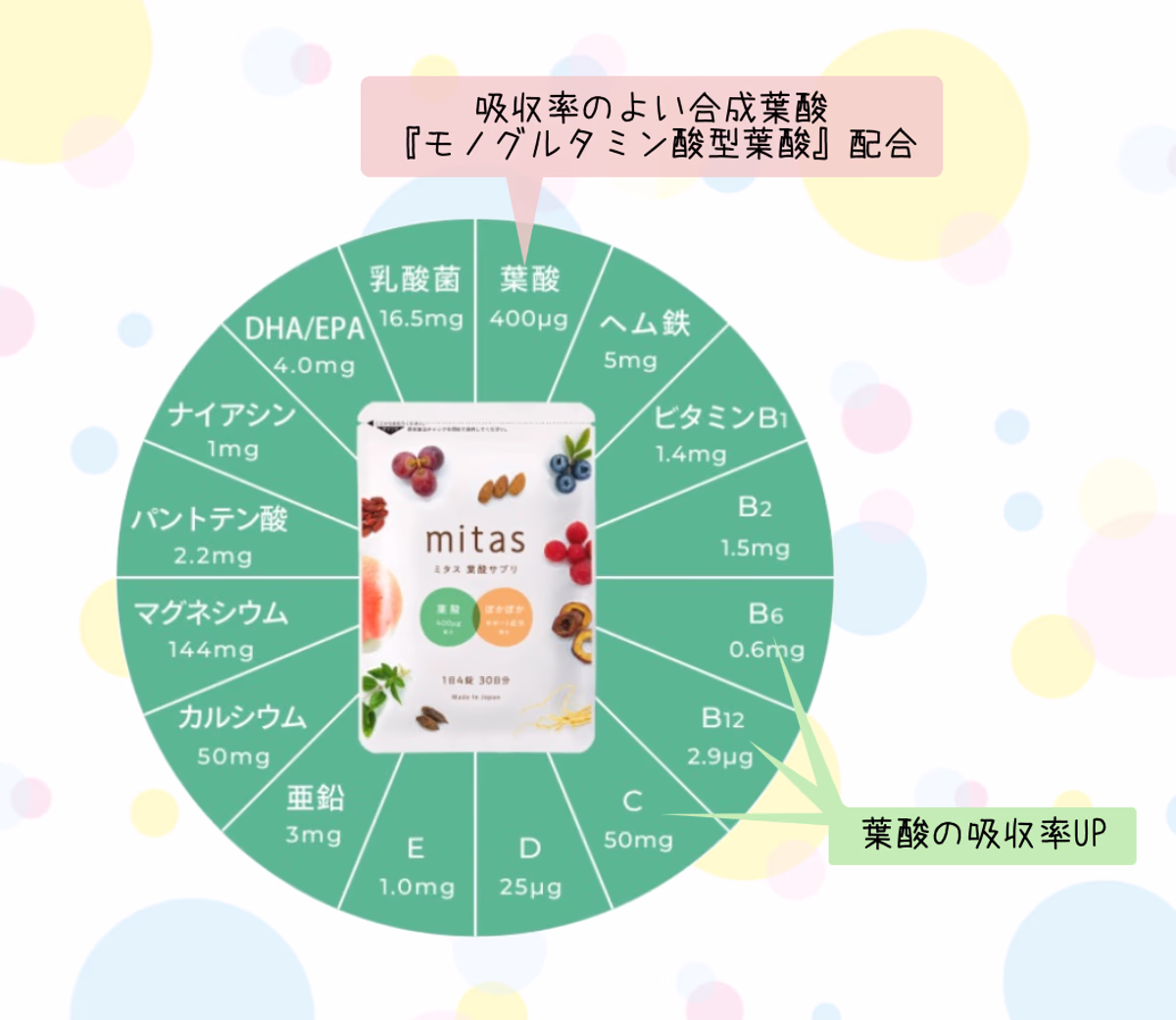 妊活に特化したサプリメントmitas(ミタス)は、吸収率のよい合成葉酸である「モノグルタミン酸型葉酸」を妊活中に摂取したい400μgしっかり配合。