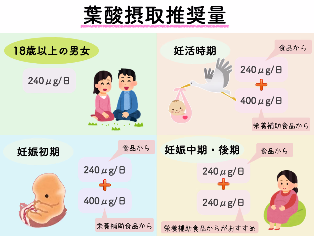 『妊娠を計画している女性、妊娠の可能性がある女性及び妊娠初期の妊婦は、胎児の神経管閉鎖障害のリスク低減のために、通常の食品以外の食品に含まれる葉酸(狭義の葉酸)を400µg/日摂取することが望まれる』