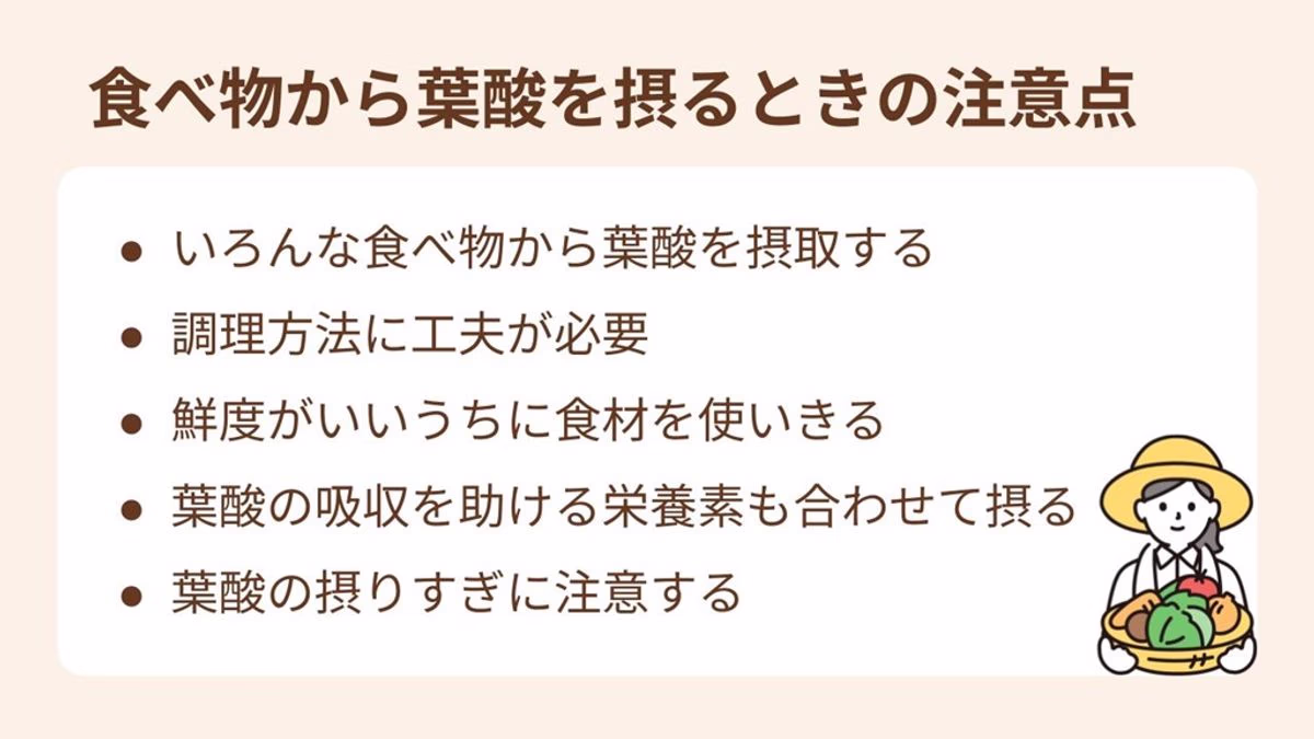 ここでは、食べ物から葉酸を摂るときの注意点について解説します。