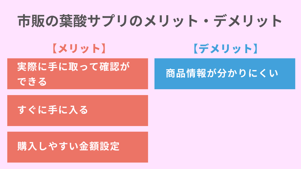 市販の葉酸サプリのメリット・デメリットについては、こちらの記事でも解説しています。