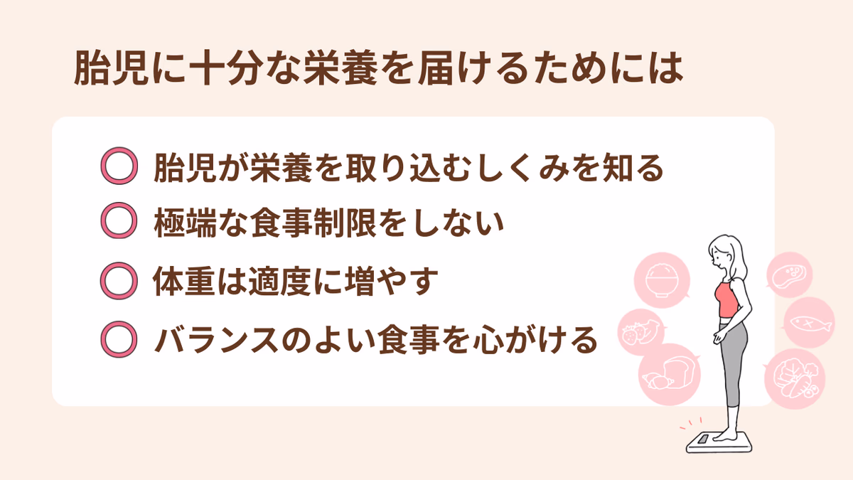 バランスのとれた食事と規則正しい生活習慣を心がけることで、赤ちゃんに必要な栄養が届けられ順調に成長していくでしょう。