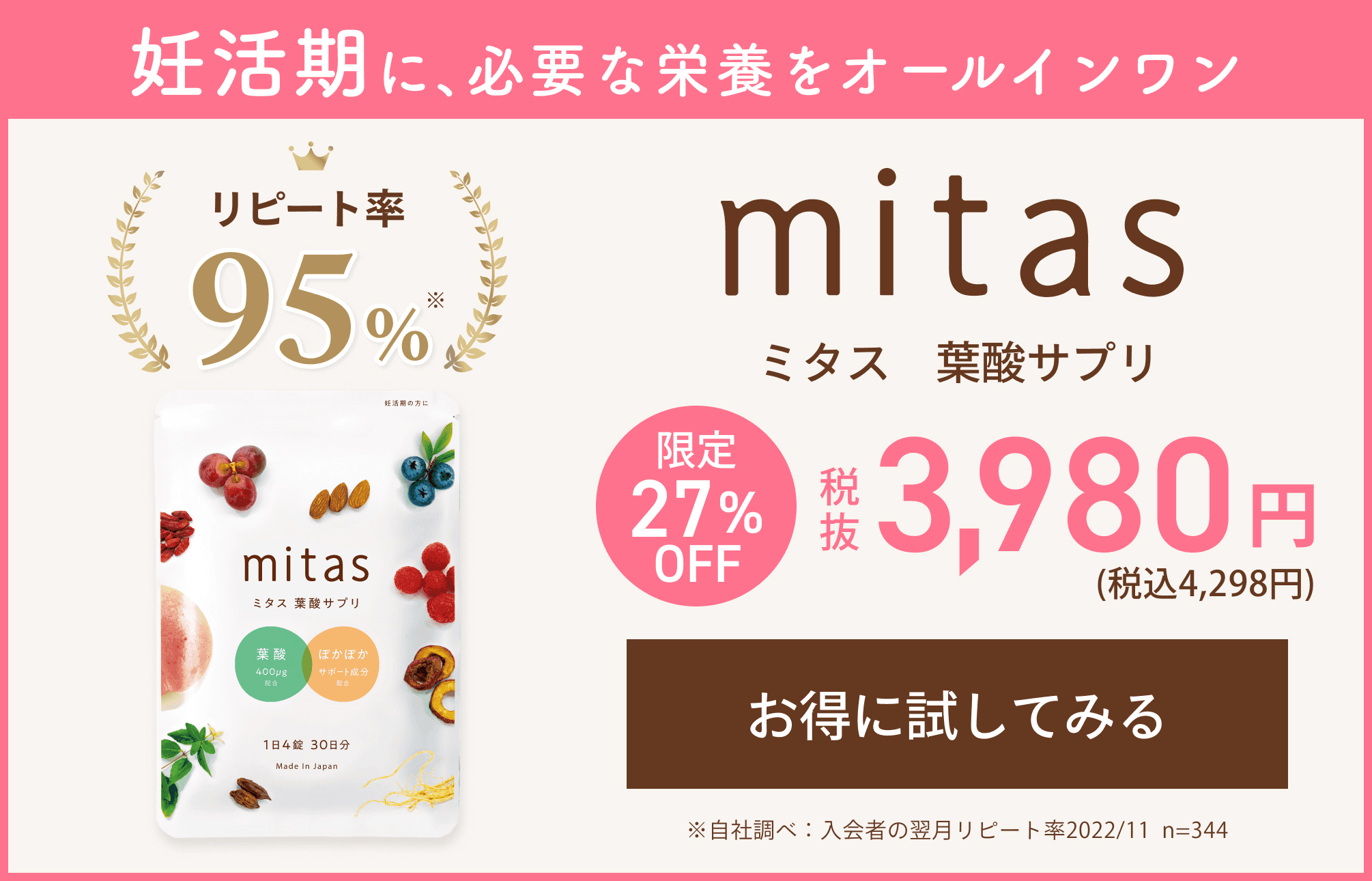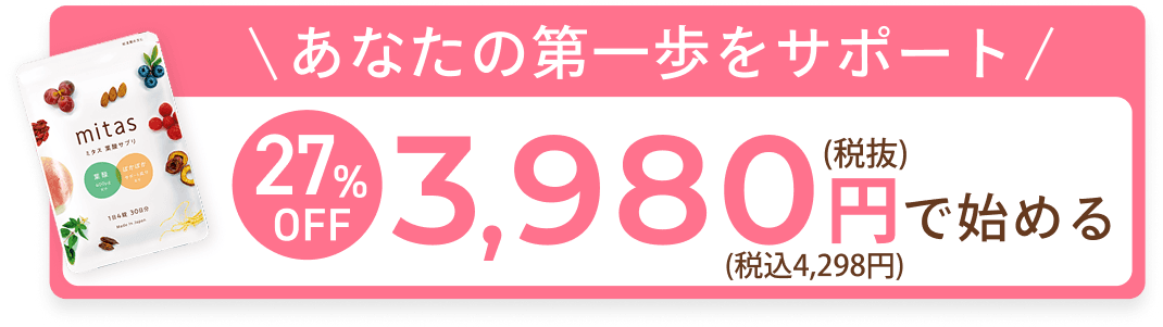 そんな方におすすめなのが、妊活サプリの「mitas(ミタス)」です。mitasは、基礎体温を安定させたい妊活中の方に摂って欲しい栄養素がたっぷりと配合されたサプリメント。