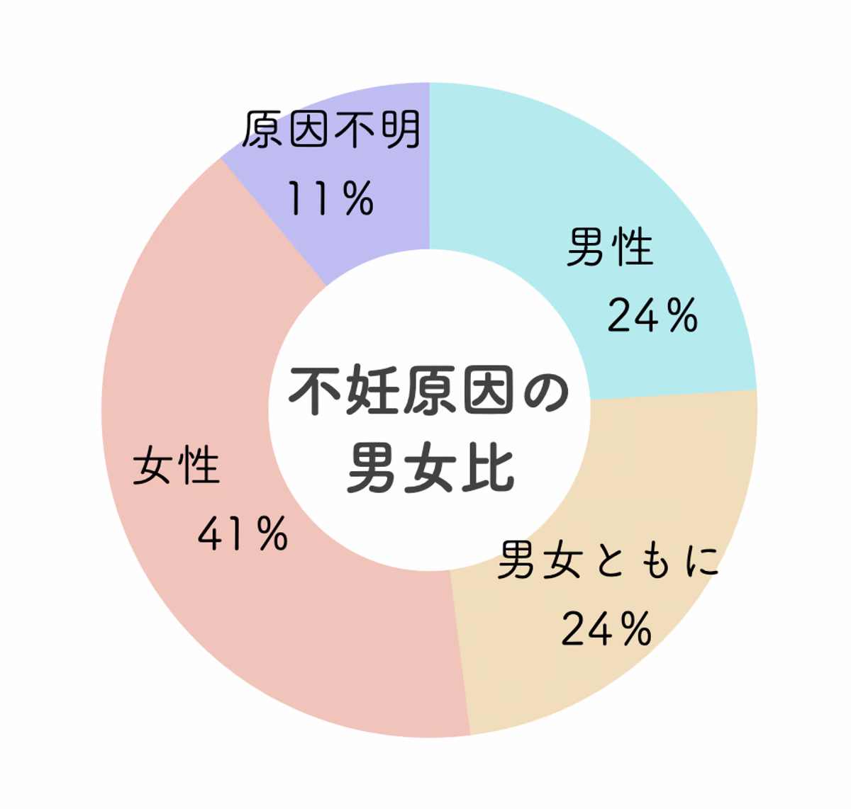 不妊の原因は女性にあると思われがちですが、実は、不妊原因の約半分は男性も関係しています。WHOの調査結果では、不妊の原因の男女比は男性24%、男女共に24%、女性41%、原因不明11%。