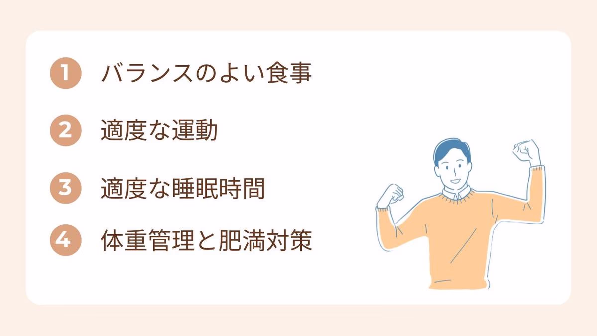 適度な運動や睡眠、バランスの取れた食生活でストレスを発散させましょう。