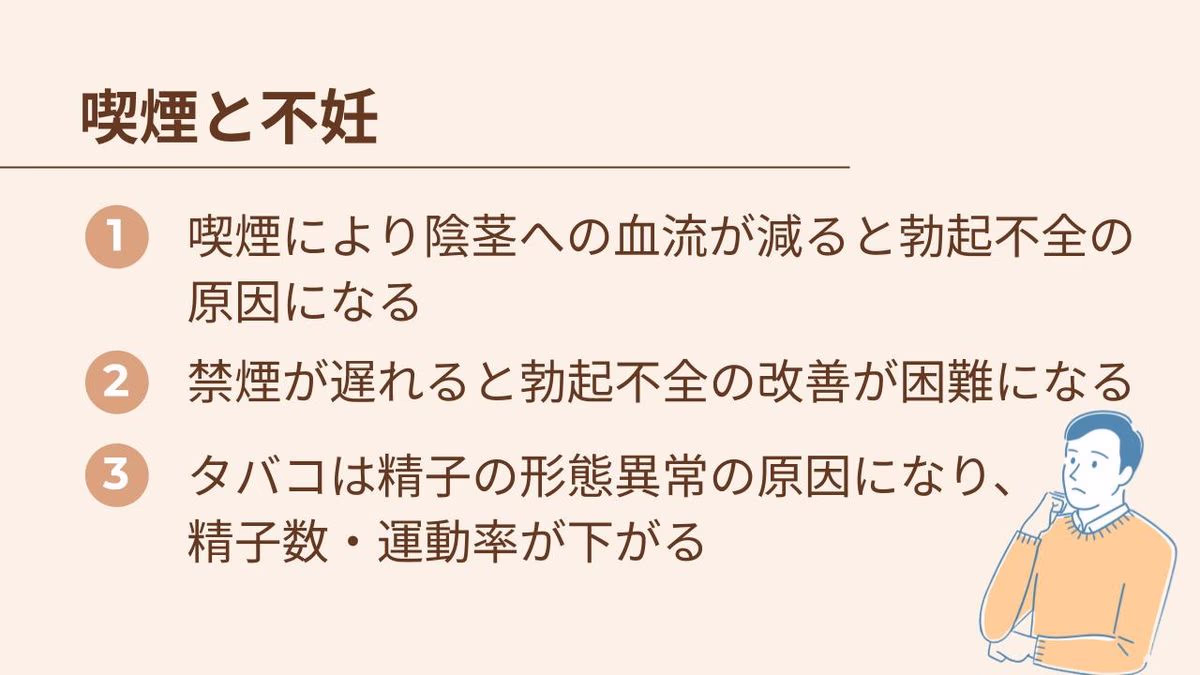 喫煙をする男性は、喫煙しない人に比べて勃起障害や精子の運動率の低下、数の減少、形態異常の増加が報告されています。