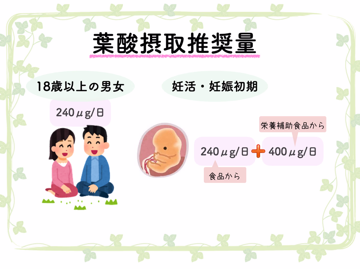 厚生労働省では、食事から摂取できる240μgの葉酸に加え、400μg/日をサプリから取るように推奨しています。