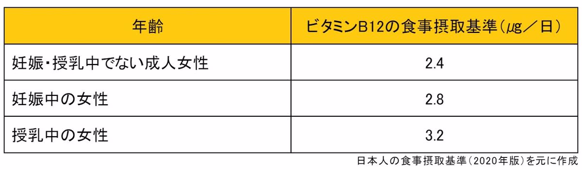 妊娠や授乳をしていない成人女性で、ビタミンB12は1日に2.4㎍摂取するのが望ましいといわれています。