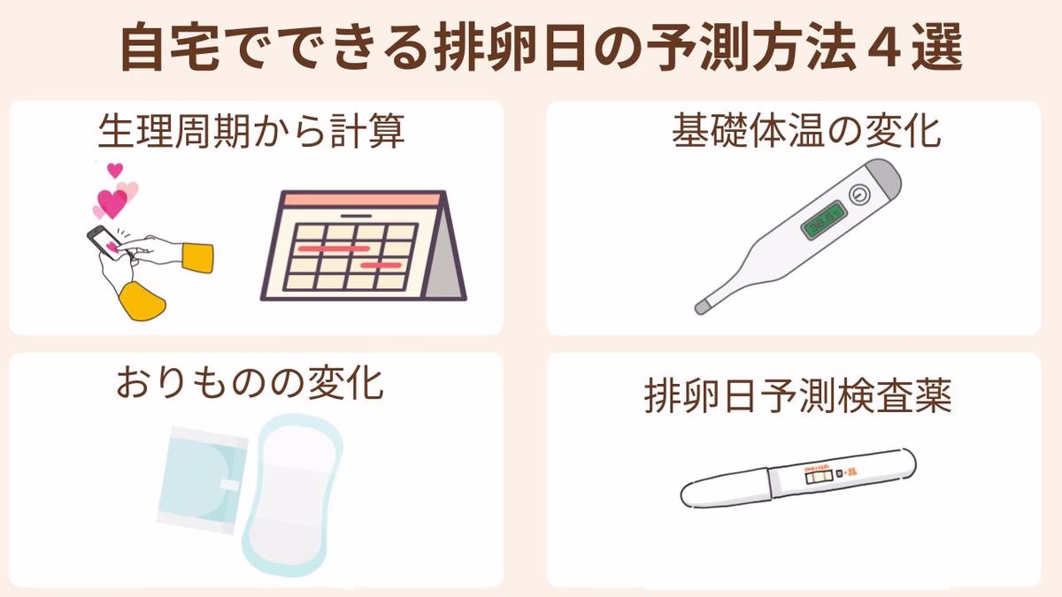 自宅でできる排卵日の予測方法には、生理周期から計算したり、基礎体温やおりものの変化をみたり、排卵日予測検査薬を使う方法があります。