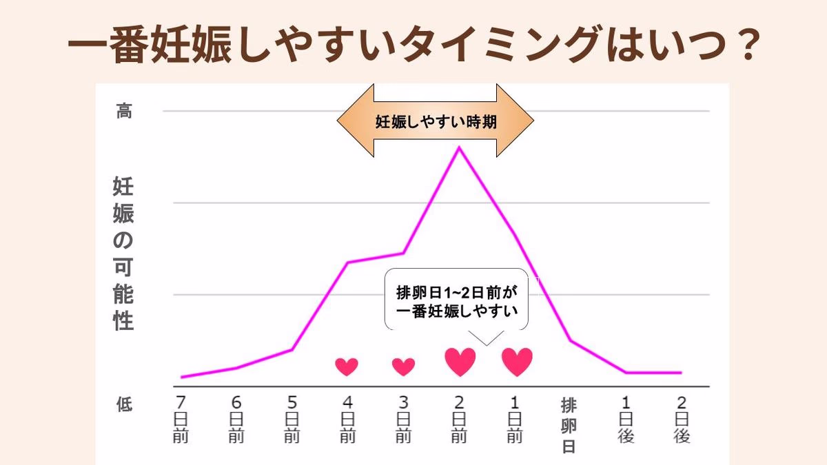 一番妊娠しやすいタイミングは排卵日当日ではなく、排卵日の1〜2日前と考えられています。また、排卵6日以前と排卵日翌日以降は妊娠率が低くなるとされています。
