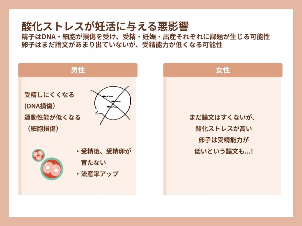 たんぱく質やDNAといった物質が酸化ストレスの影響を受けやすく、精子の原材料もたんぱく質・DNAですので精子にも影響が出ると考えるとわかりやすいでしょう。