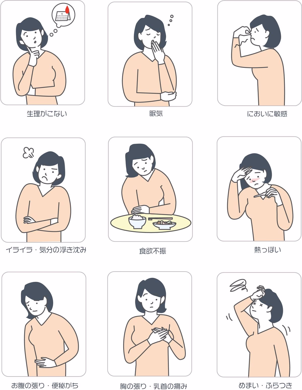 妊娠がわかる前によく見られる症状は以下のとおりです。