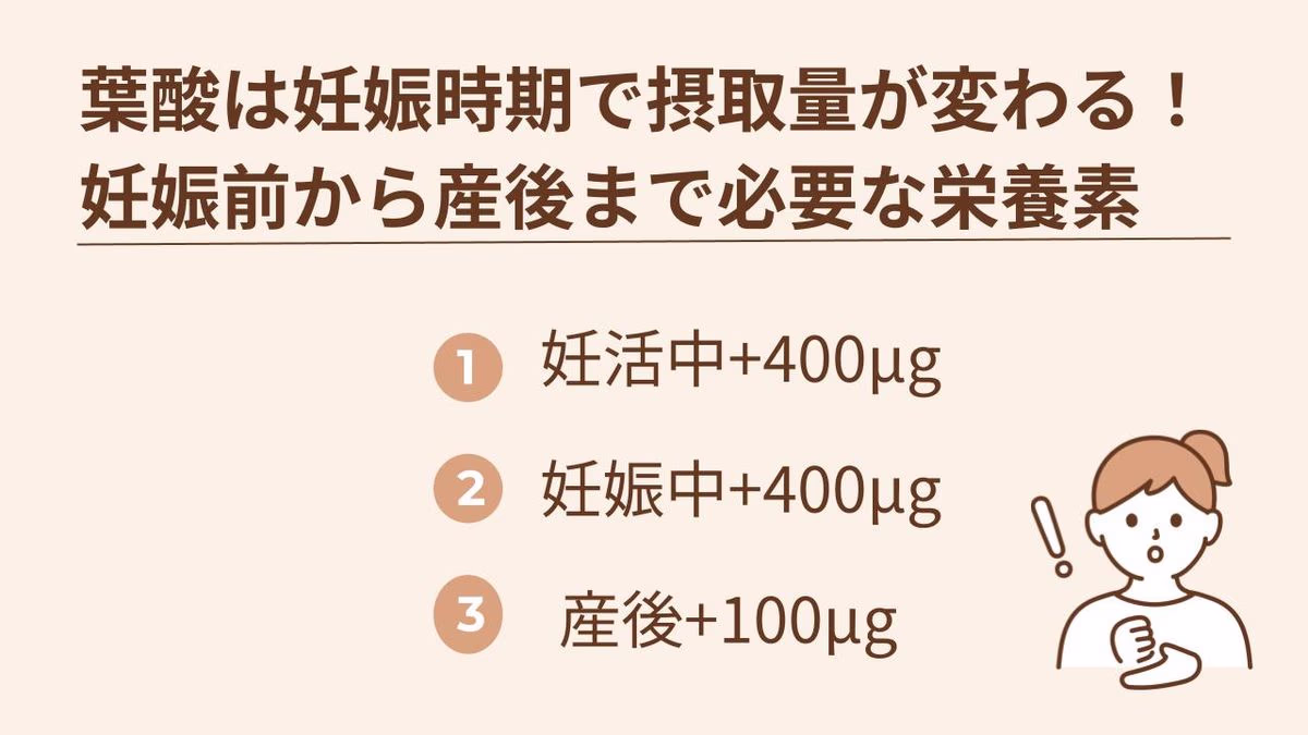 また、妊娠時期により葉酸の摂取目安量が変わることをご存知でしょうか?