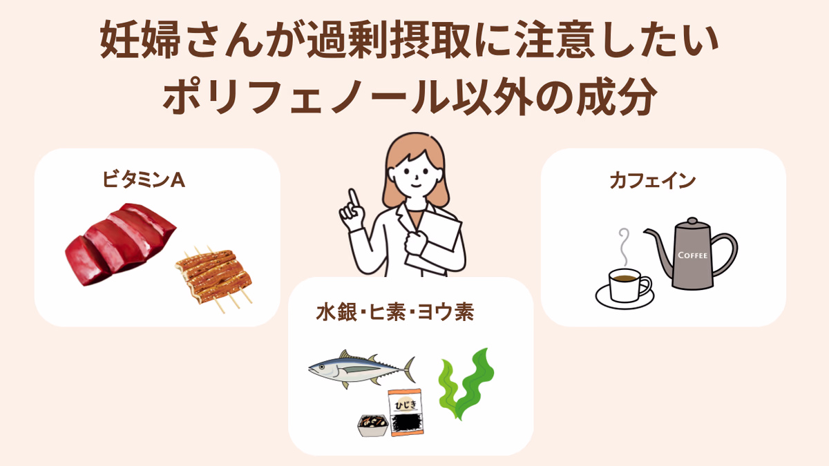 ポリフェノールのほかにも、妊娠中に摂取に注意すべき成分はいくつかあります。mamaruにはこういった成分は含まれていないため、安心して摂取できます。