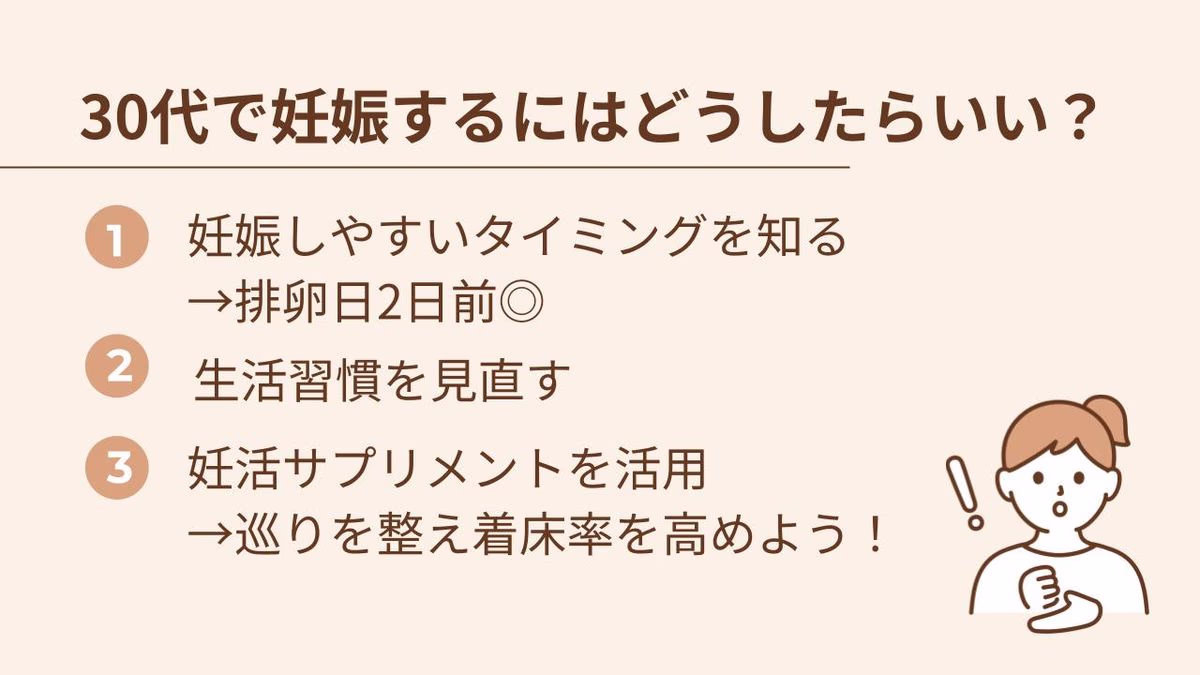 では、30代で妊娠するにはどうしたらいいのでしょうか。自然妊娠を望む方も多いと思いますが、日々の生活で大切なポイントを紹介します。