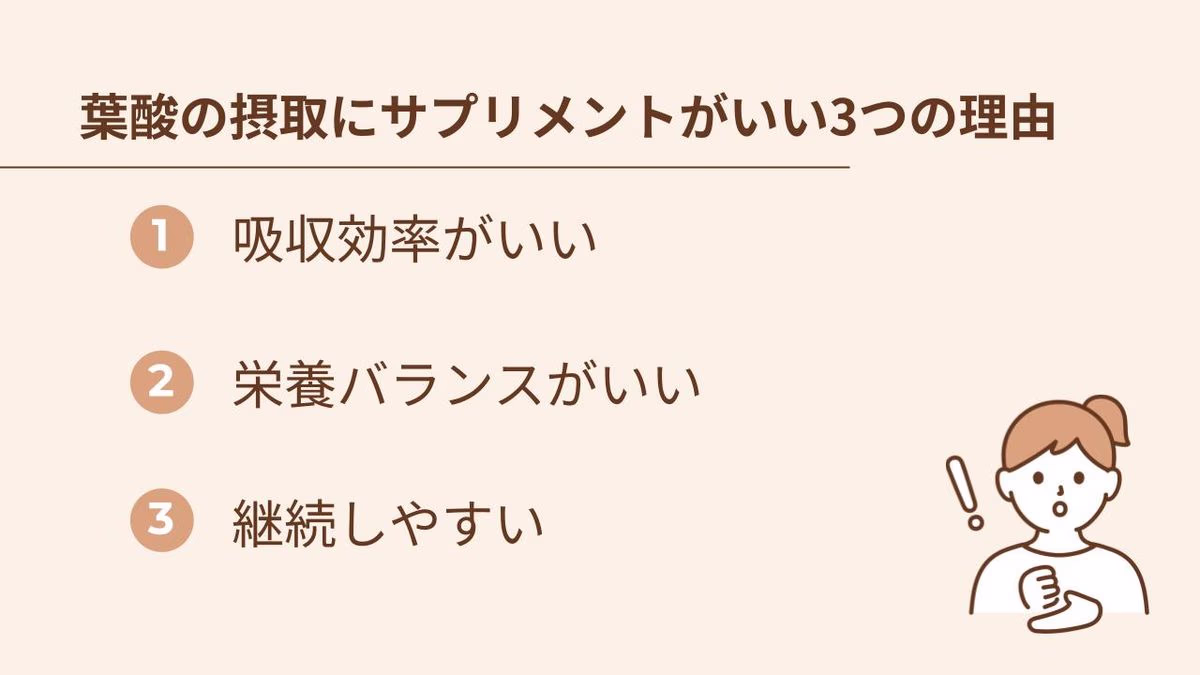 サプリメントをおすすめする一番の理由は、サプリメントに含まれる葉酸は吸収率が高いためです。