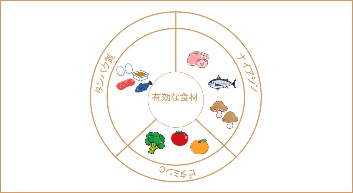 - ナイアシンを多く含む食材 →魚・肉・きのこ・雑穀など