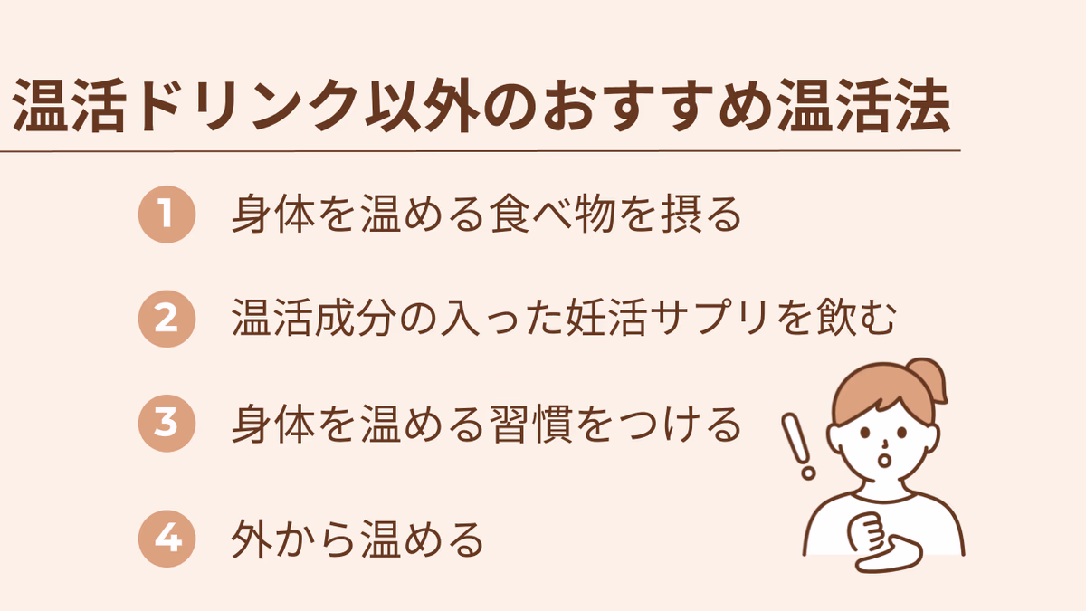 妊活中は、温活ドリンクを飲むこと以外にもおすすめしたい温活方法があります。