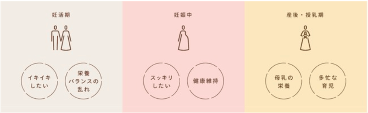 この様に、妊活期、妊娠期、産後・授乳期の時期別に変化する必要な栄養素や悩みを意識した生活が必要となってきており、非常に手間や負担がかかります。