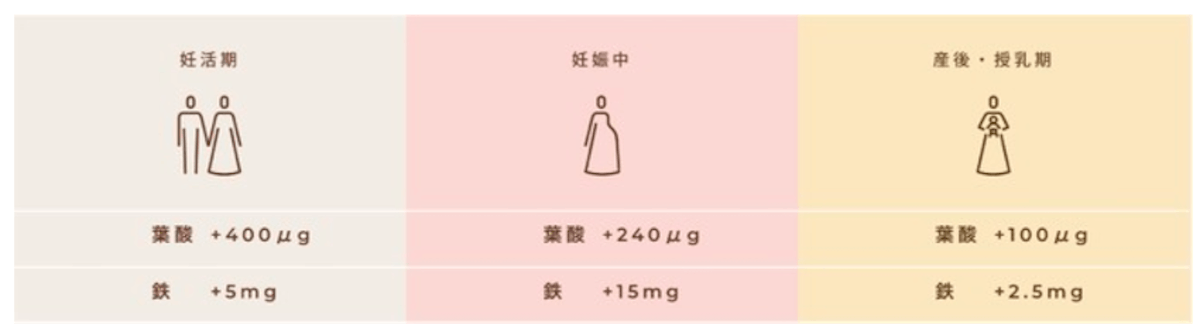 厚生労働省が定める栄養摂取量は、実は妊活中、妊娠中、産後では異なります。