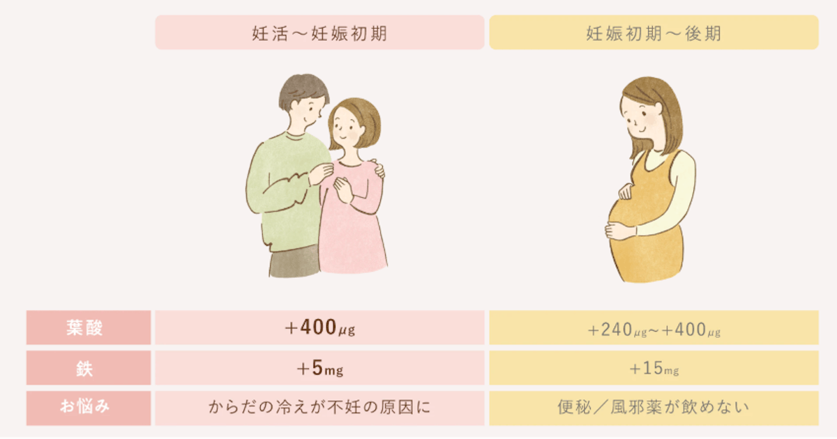 実は妊活期と妊娠期では必要な栄養素は違います。市販の葉酸サプリは「妊活期」と「妊娠期」を分けていないものもありますが、時期ごとに必要な栄養素を摂ることが大切です。
