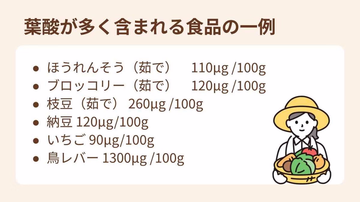 葉酸はビタミンB群のひとつで、お腹の中の赤ちゃんの細胞分裂や成長、DNAの形成に不可欠な栄養素です。