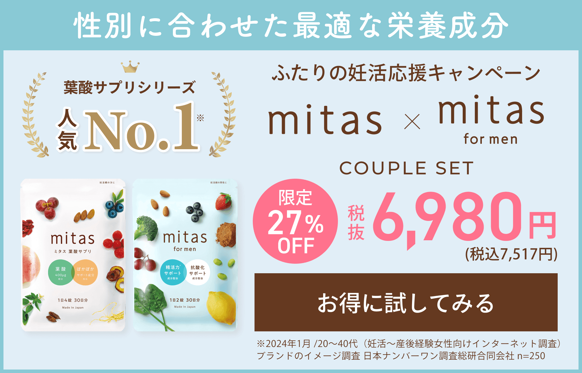 男性妊活におすすめの葉酸サプリは『mitas for men(ミタスフォーメン)』です。男性不妊を専門とする医師が監修し、妊活中の男性に必要な栄養をバランスよく配合しています。